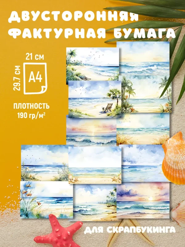 Солнечная коллекция бумаги для скрапбукинга перенесёт вас в атмосферу беззаботного пляжного отдыха. Двухсторонний дизайн формата А4 воплощает всю красоту морского побережья в каждой детали.