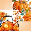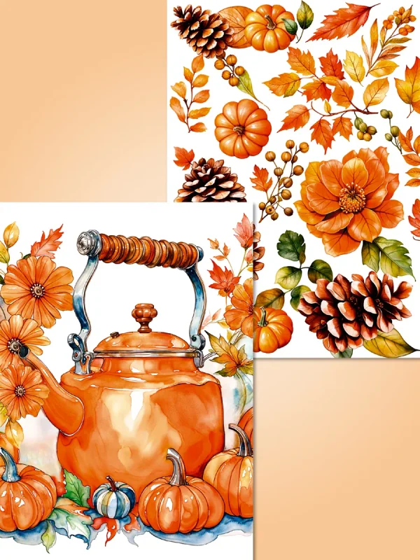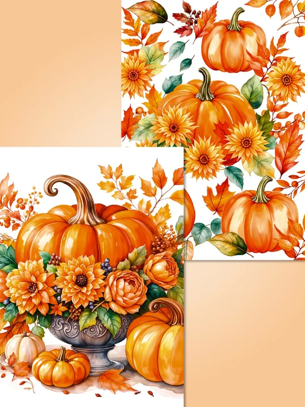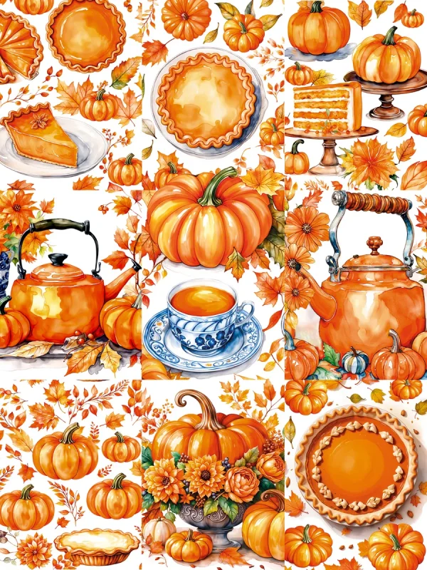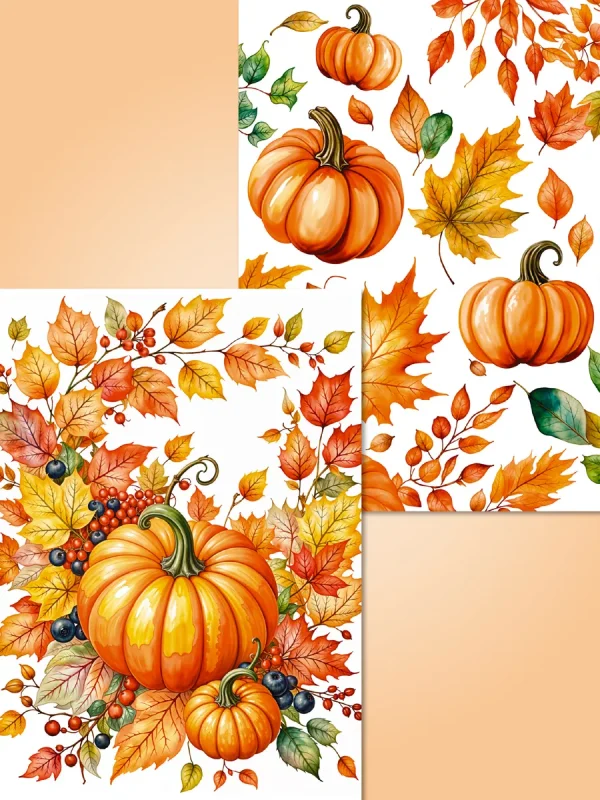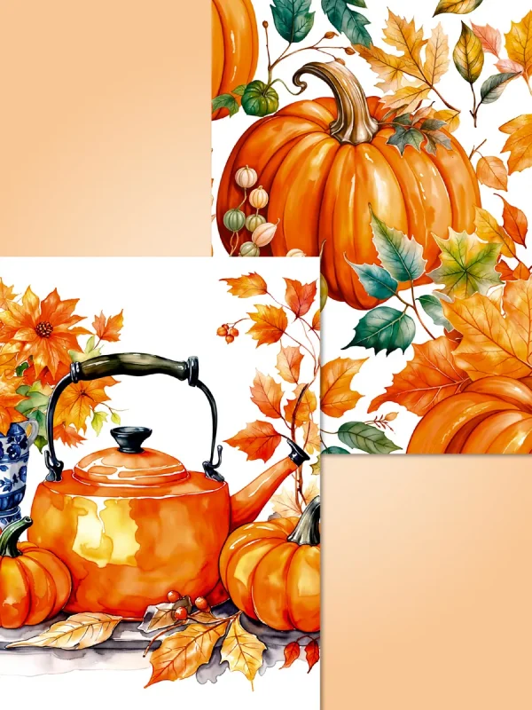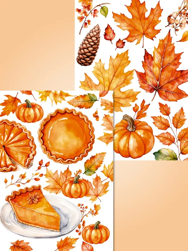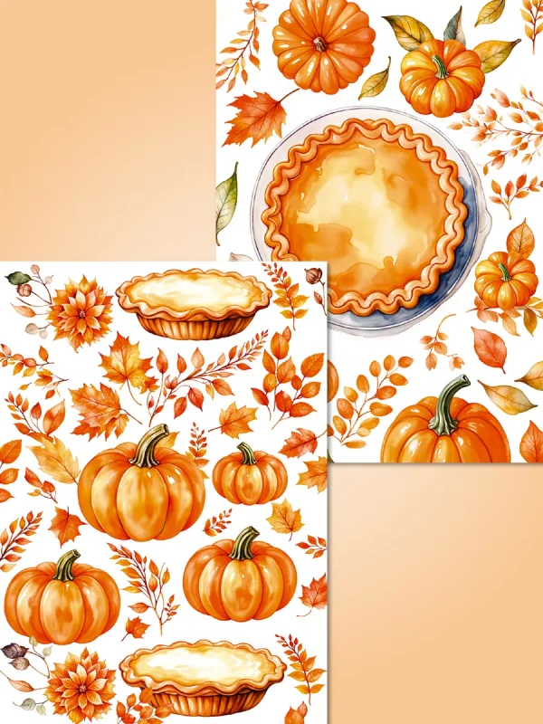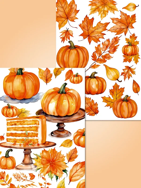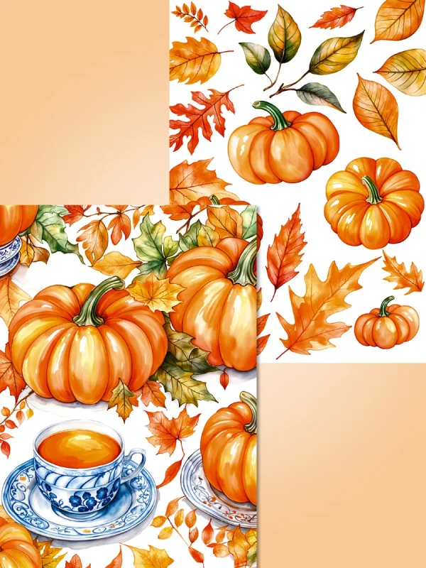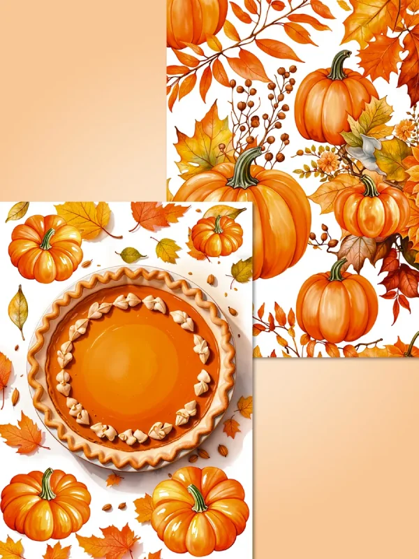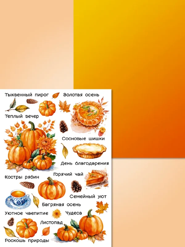 - Тематические элементы: изображения тыкв, осенних листьев, пирога