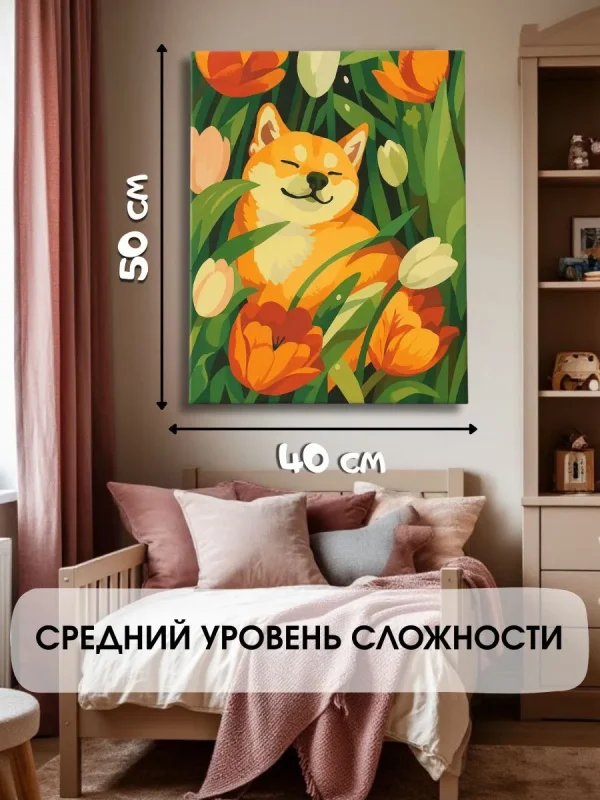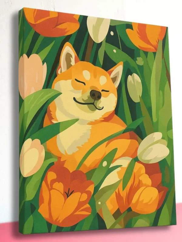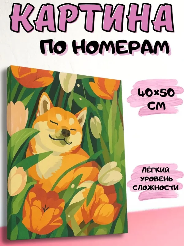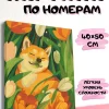Картина по номерам на холсте с подрамником “Акита в тюльпанах”