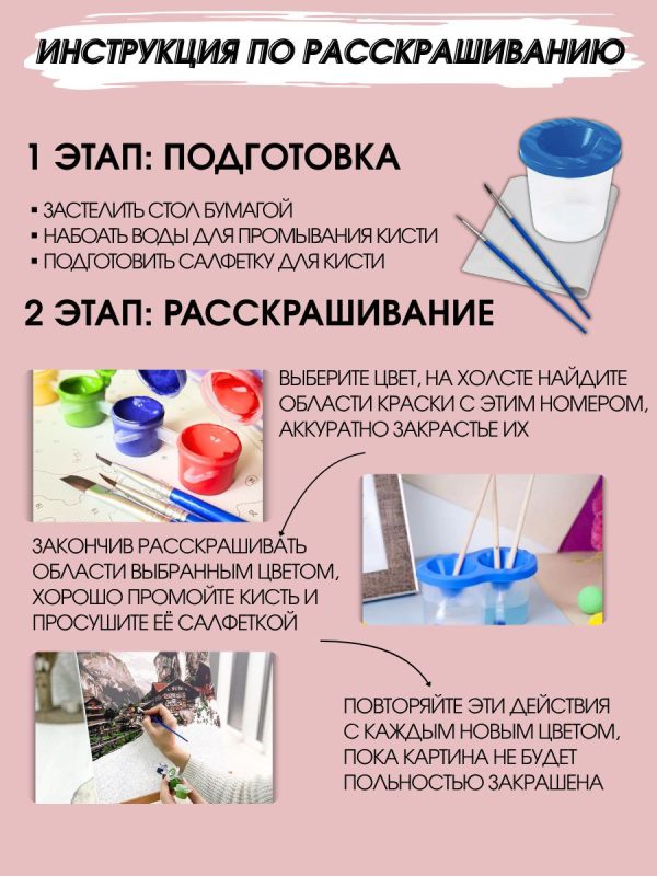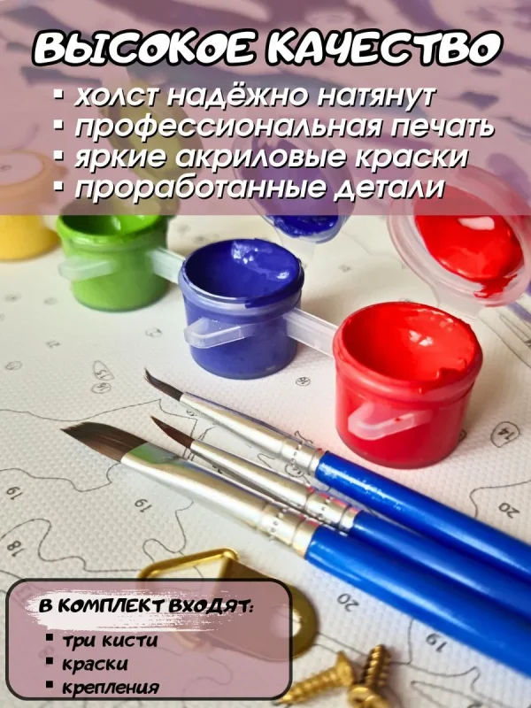 Картина по номерам — это уникальный набор для творчества, позволяющий создать настоящее произведение искусства даже тем, кто никогда не держал кисть в руках. Основа разделена на пронумерованные участки, каждый из которых нужно закрасить краской соответствующего номера.