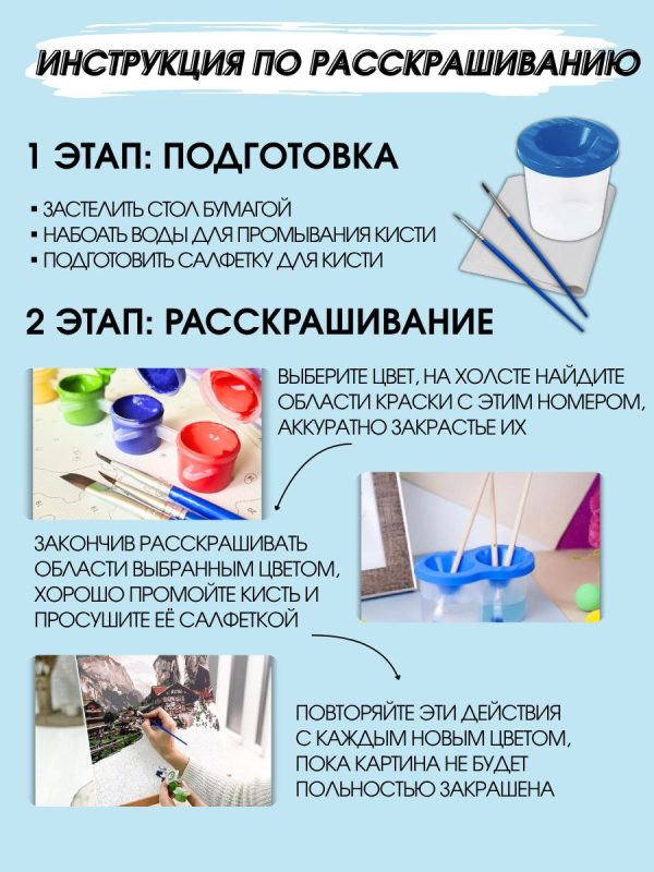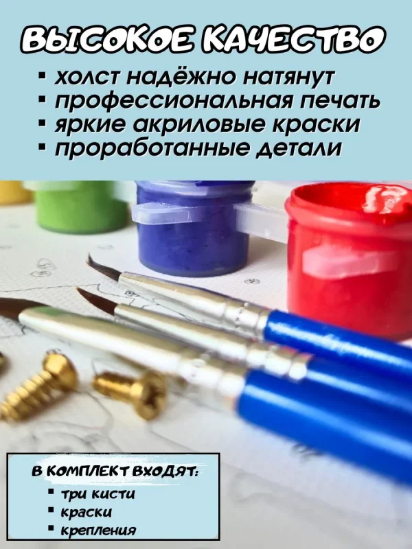 Картина по номерам — это уникальный набор для творчества, позволяющий создать настоящее произведение искусства даже тем, кто никогда не держал кисть в руках. Основа разделена на пронумерованные участки, каждый из которых нужно закрасить краской соответствующего номера.