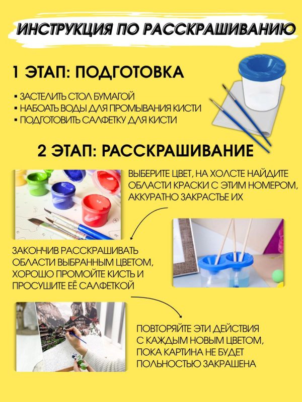 Картина по номерам — это уникальный набор для творчества, позволяющий создать настоящее произведение искусства даже тем, кто никогда не держал кисть в руках. Основа разделена на пронумерованные участки, каждый из которых нужно закрасить краской соответствующего номера.