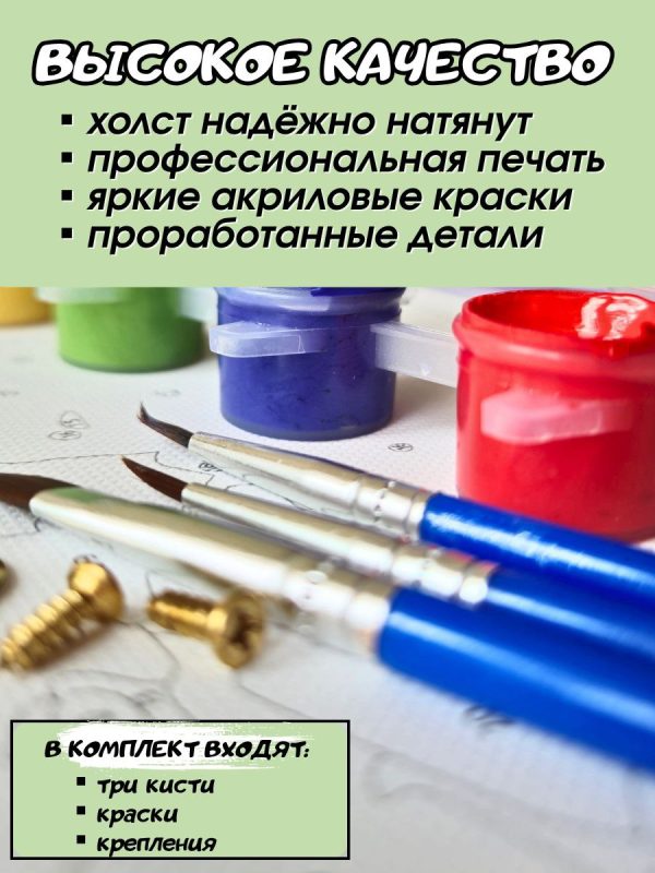 Картина по номерам — это уникальный набор для творчества, позволяющий создать настоящее произведение искусства даже тем, кто никогда не держал кисть в руках. Основа разделена на пронумерованные участки, каждый из которых нужно закрасить краской соответствующего номера.