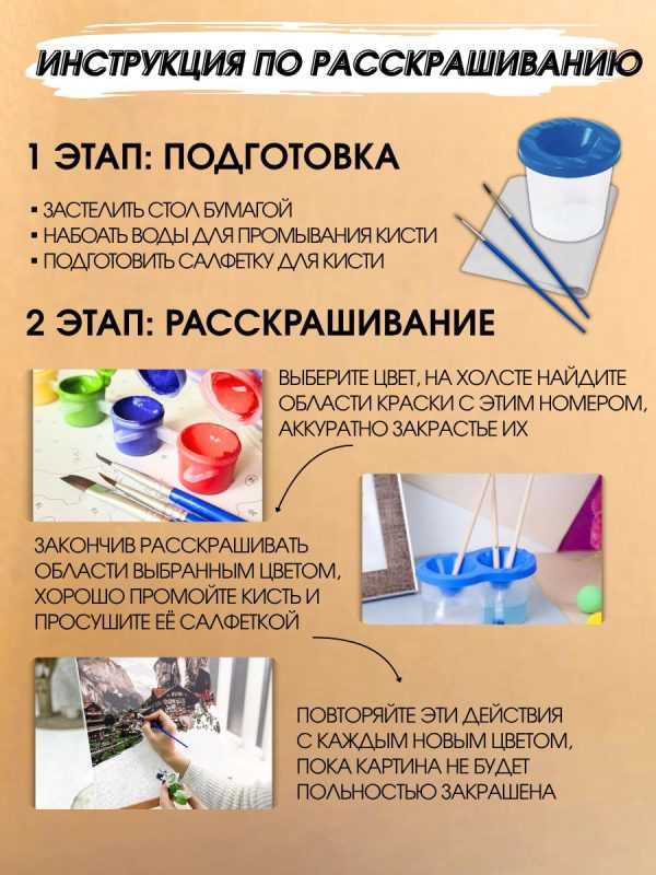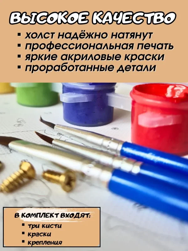 Картина по номерам — это уникальный набор для творчества, позволяющий создать настоящее произведение искусства даже тем, кто никогда не держал кисть в руках. Основа разделена на пронумерованные участки, каждый из которых нужно закрасить краской соответствующего номера.