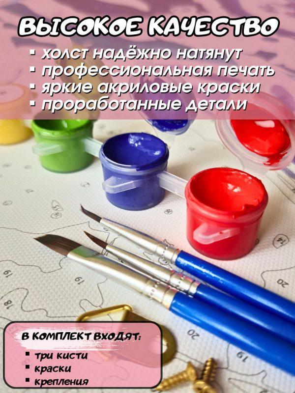 Картина по номерам — это уникальный набор для творчества, позволяющий создать настоящее произведение искусства даже тем, кто никогда не держал кисть в руках. Основа разделена на пронумерованные участки, каждый из которых нужно закрасить краской соответствующего номера.