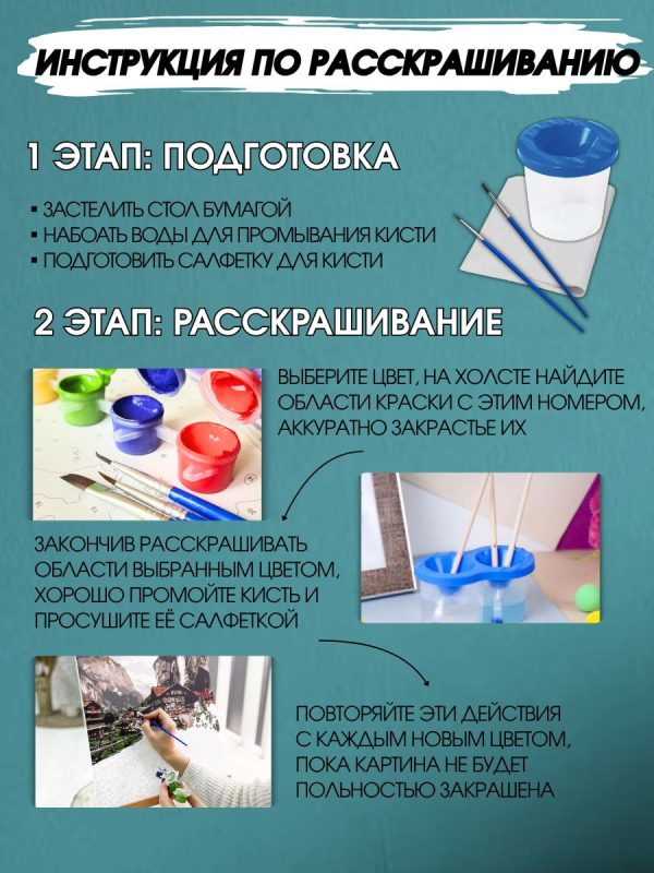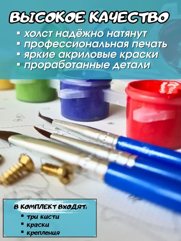 Картина по номерам — это уникальный набор для творчества, позволяющий создать настоящее произведение искусства даже тем, кто никогда не держал кисть в руках. Основа разделена на пронумерованные участки, каждый из которых нужно закрасить краской соответствующего номера.
