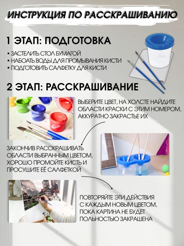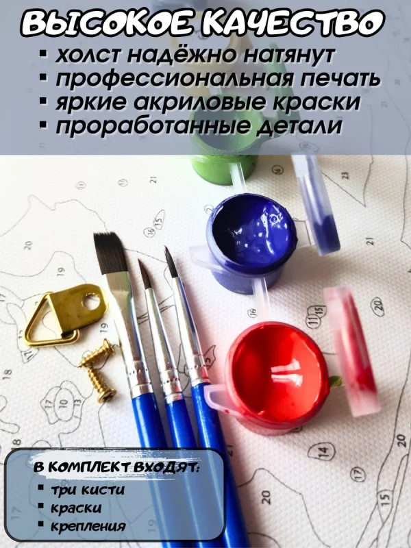 Картина по номерам — это уникальный набор для творчества, позволяющий создать настоящее произведение искусства даже тем, кто никогда не держал кисть в руках. Основа разделена на пронумерованные участки, каждый из которых нужно закрасить краской соответствующего номера.