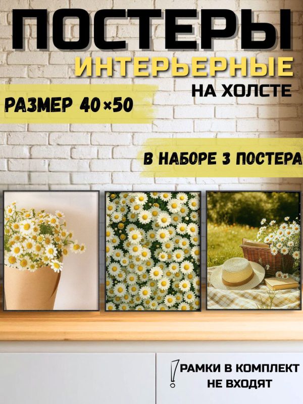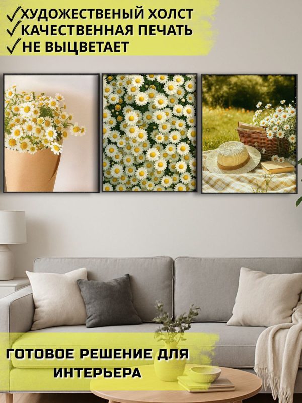 Набор постеров «Ромашки» — это очаровательное украшение для вашего интерьера, которое наполнит пространство теплом, уютом и атмосферой летнего поля.